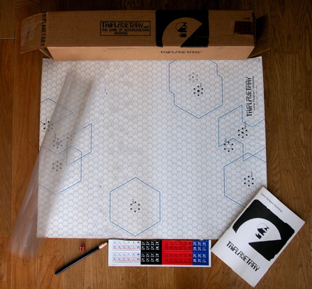 Fig. 1は、私の所有している初版の"Triplanetary"である。段ボールのボックスの中に、軟質ビニルシートとヘクスマップが丸めて入っていた。当時の段ボール製ボックスとオリジナルの赤いクリアダイス、巻き紙クレヨン・ペンシル(未使用)の付属品が揃っている。マップのcopyrightが1975なので初版の第2刷と考えられる(ルールのcopyrightは1973)。