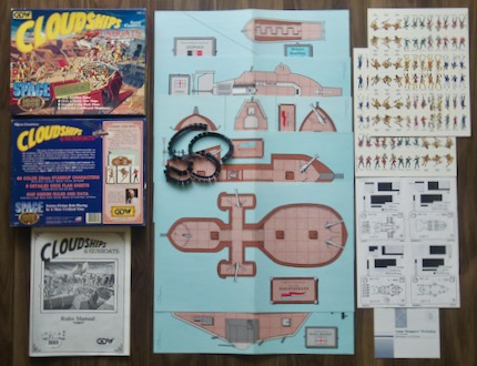 "Cloudships & Gunboats"は、Sky Galleons of Marsでは抽象化されていた乗り込み戦闘を紙製のミニチュア駒とデッキプランを使って対地球人、対火星人戦闘をシミュレーションするゲーム拡張である。Cloudships & Gunboatsは、ホビージャパンの翻訳RPGのラインナップに入っていなかったSpace: 1889 のボードゲームであるSky Galleons of Marsのゲーム拡張のため、日本国内では全く見かけないゲームである。