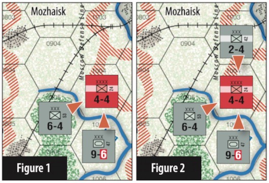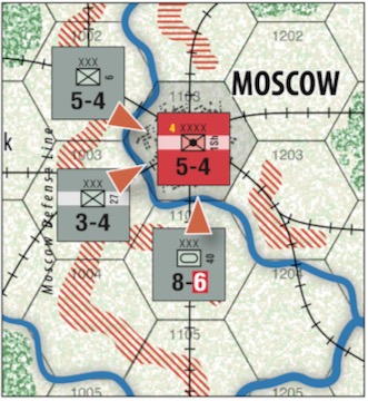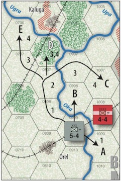 ドイツ軍プレーヤーが駒を配置した後(手順4)、ロシア軍プレーヤーは ヘクス0503、ヘクス0608、ヘクス0803 (Mozhaisk)にある3個の予備軍(すなわち、ドイツ軍ZOCにいない軍)を一部または全部、 再配置することができる。