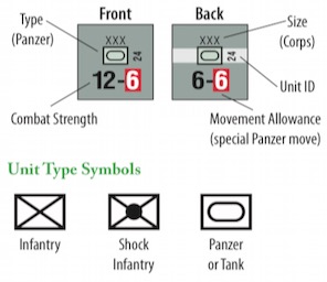 ゲームカウンター上の数字や記号はそのゲームカウンターでシミュレートしている部隊の戦力や種類を表している。