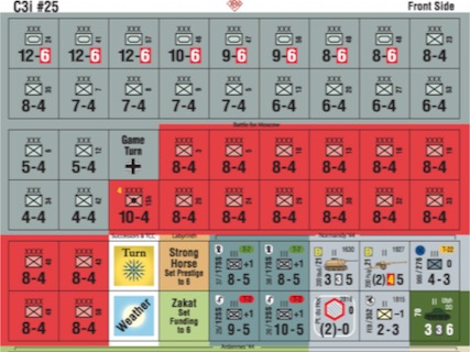 これらは戦闘結果表(CRT)、地形効果表(TEC)、及びターン記録トラックである。
