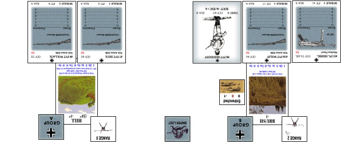 ドイツ軍は良い状態ではない。敵軍は5人の兵士が2グループを構成しています。ドイツ軍Aグループは、Wollack 2等兵(#08)とBeck 2等兵(#7)が距離チット0で丘の上に居ます。ドイツ軍Bグループは、Wolff 2等兵(#10) 、Hessel 伍長(#02)とピン状態のBernhoff 2等兵(#06)が距離チット2で塹壕を構築した茂みに居ます。両軍とも1人以上の死傷者がでると、分隊崩壊するに十分な死傷者を出しています。さらにドイツ軍の狙撃兵は除去されています。