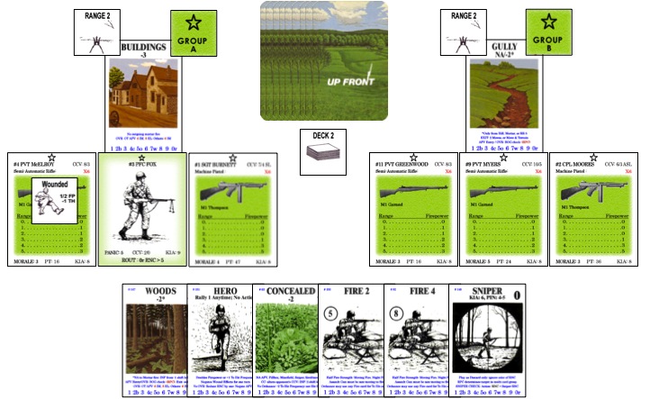 戦列部隊を使用したUP FRONTのパトロールシナリオの第2デッキです。両プレーヤーともカードを数えていますが、進行が非常に遅れていることを認識しています。あなたが担当しているアメリカ軍は、6人の兵士が2グループを構成しています。Aグループは、Burnett軍曹(#01),、負傷しているMcElroy 2等兵(#04) とピン状態のFox 1等兵からなり距離チット2で建物-3に居ます。Bグループは、Moores伍長(#02)、 Myers 2等兵(#09) とGreenwood 2等兵(#11) からなり距離チット2で枯れ谷に居ます。